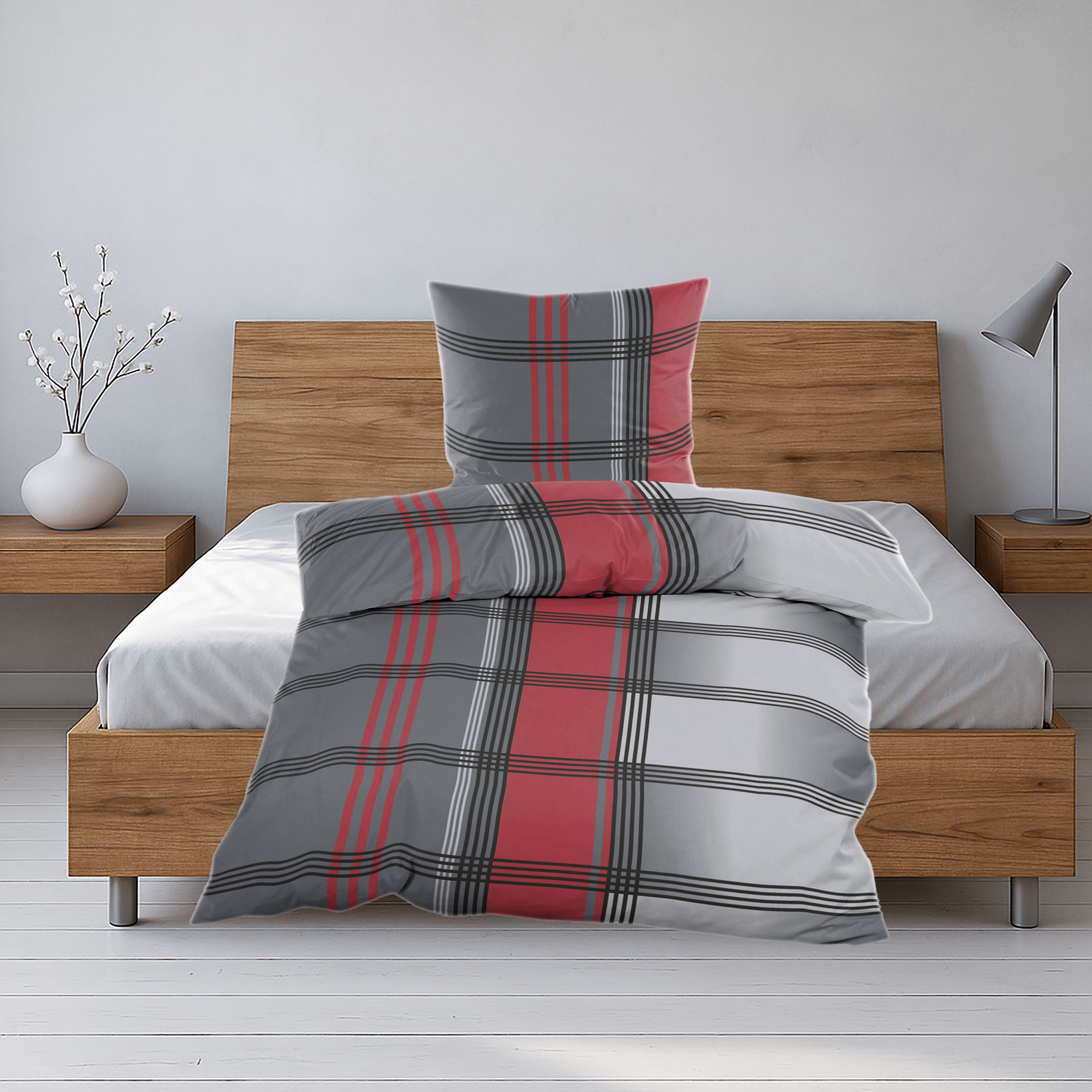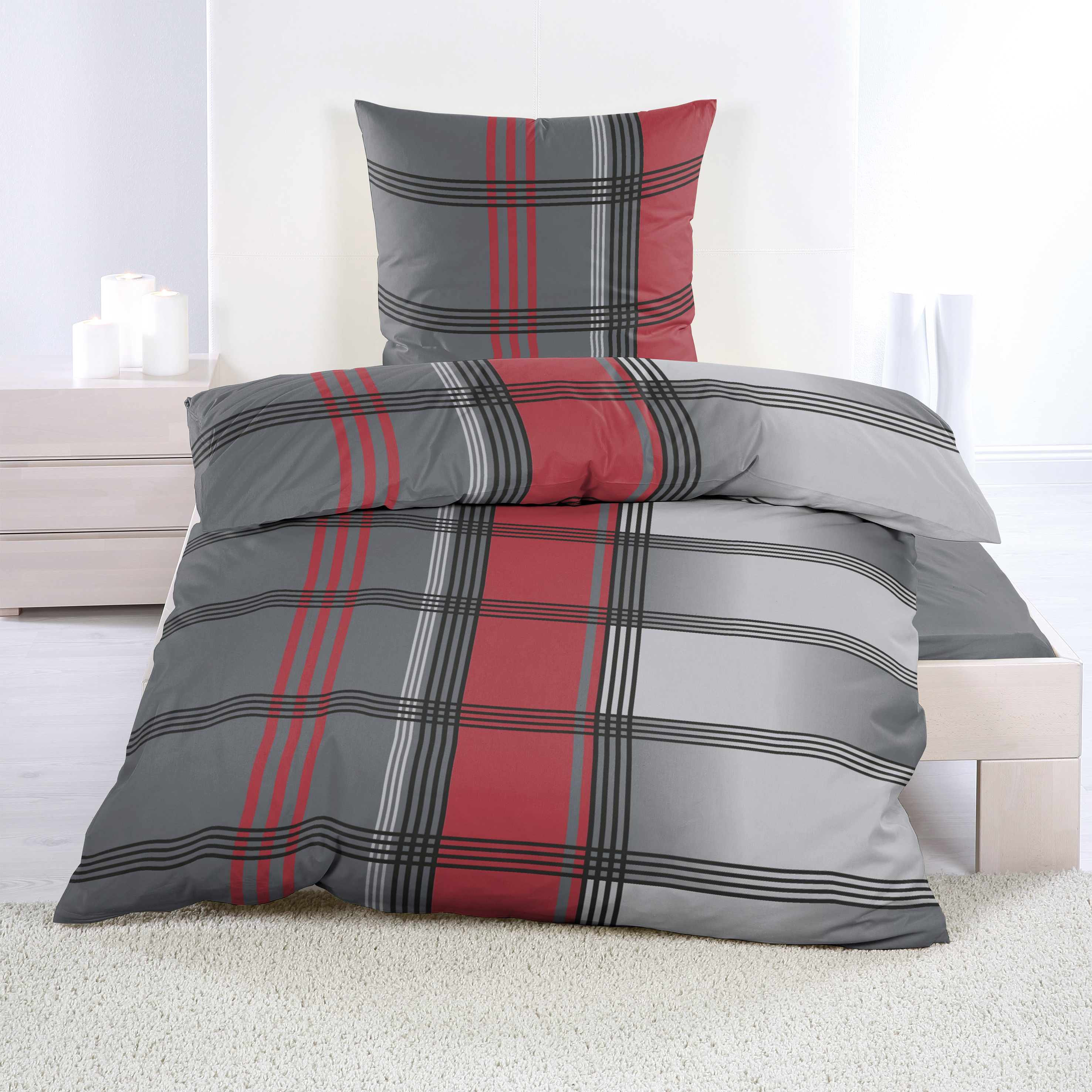 Biber Bettwäsche 135x200 cm Anthrazit Grau Rot Kariert