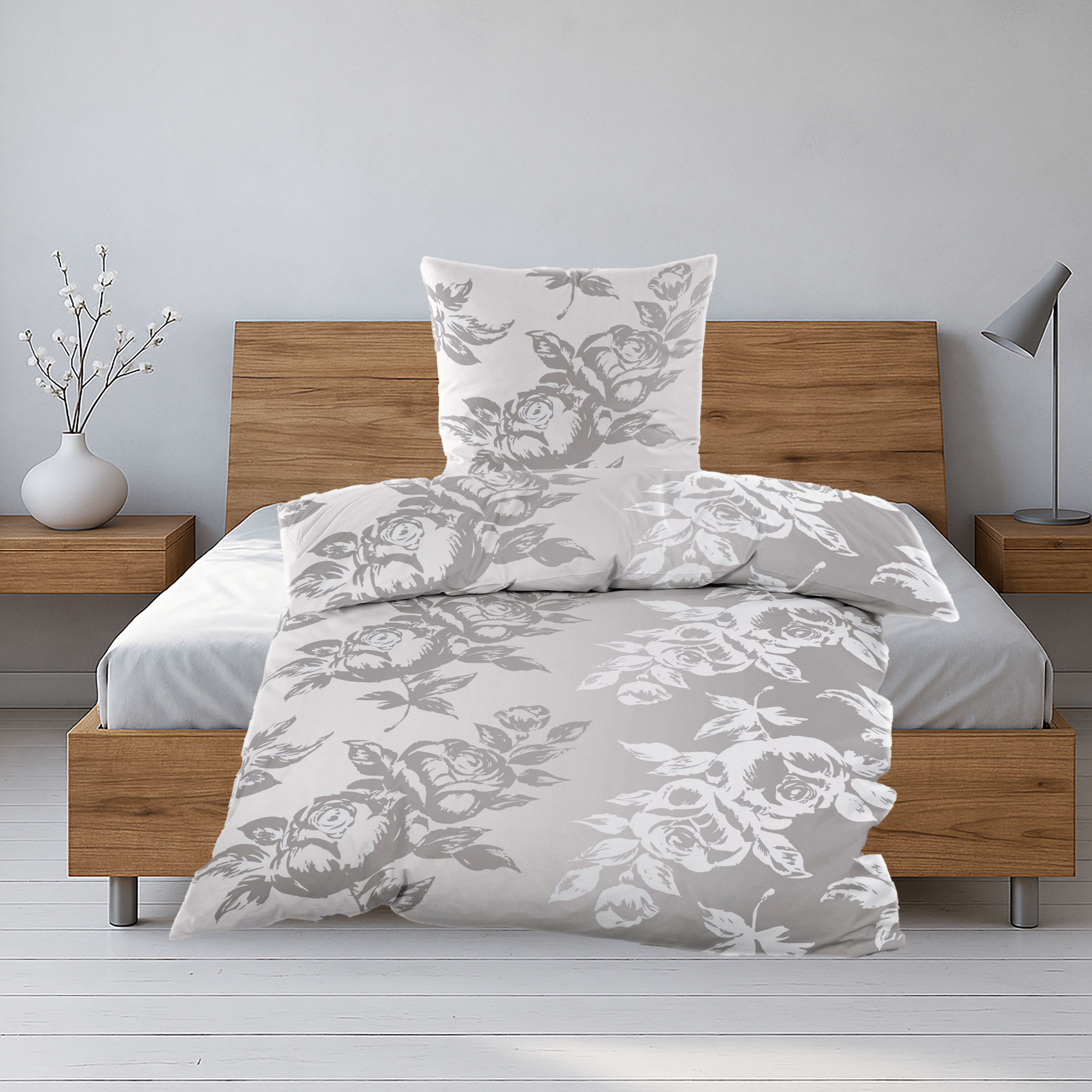Biber Bettwäsche 135x200 cm in Grau Rosenmuster