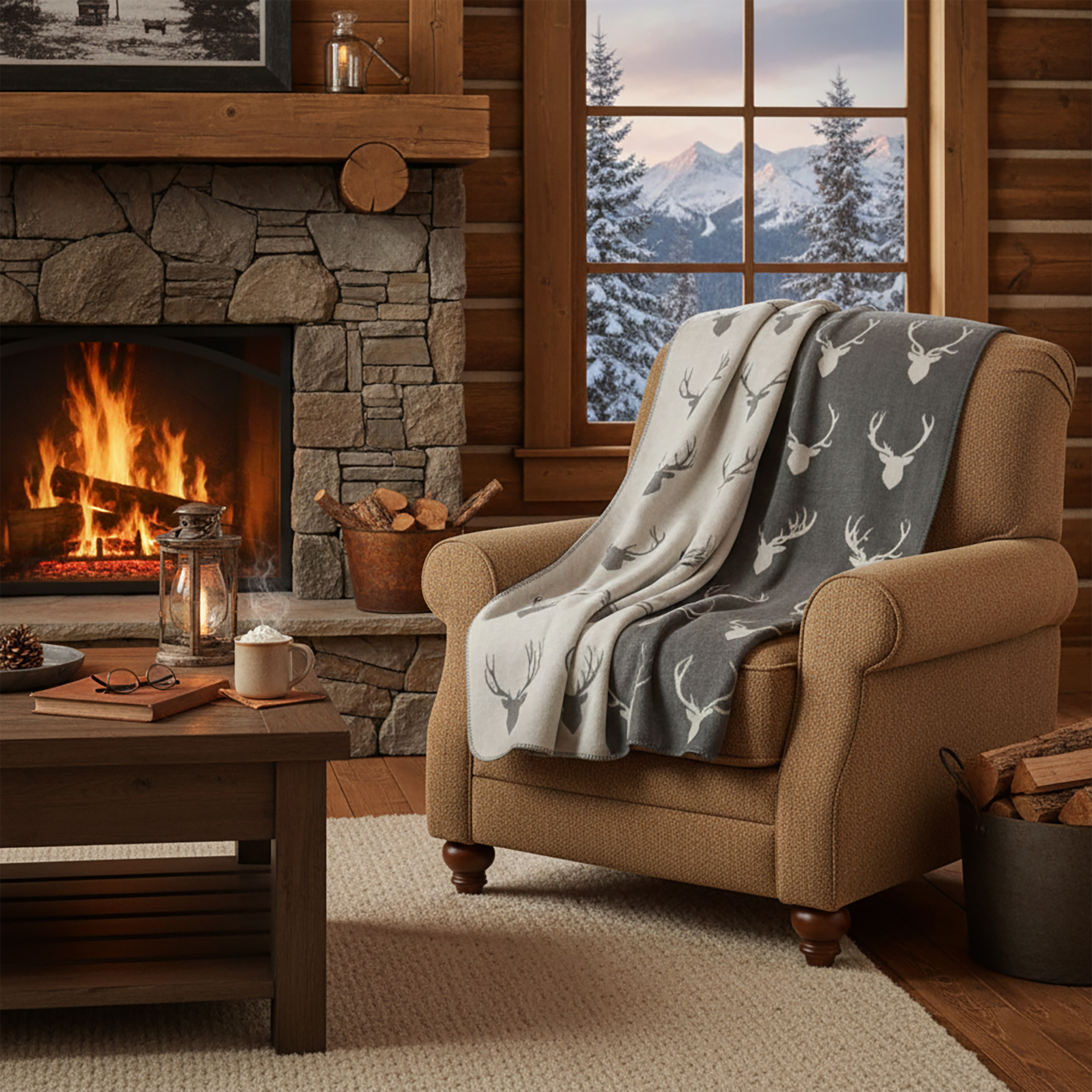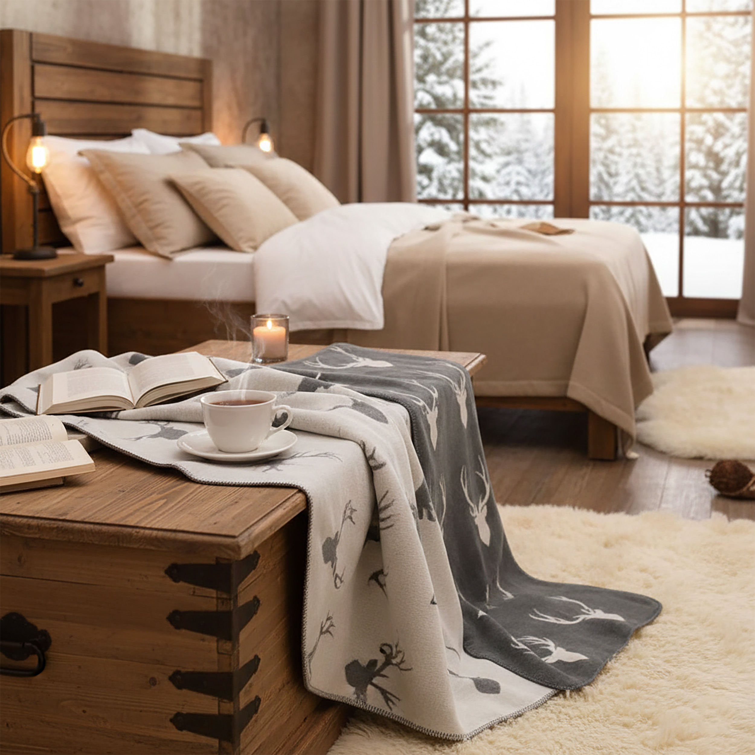 Verwandeln Sie Ihr Zuhause in eine Wohlfühloase mit unserer hochwertigen Wohn- und Kuscheldecke. Das zeitlose Design kombiniert moderne Farben mit einem klassischen Natur-Motiv und sorgt so für eine besonders heimelige Atmosphäre – egal ob an kalten Winterabenden oder als dekoratives Accessoire auf Ihrem Sofa.