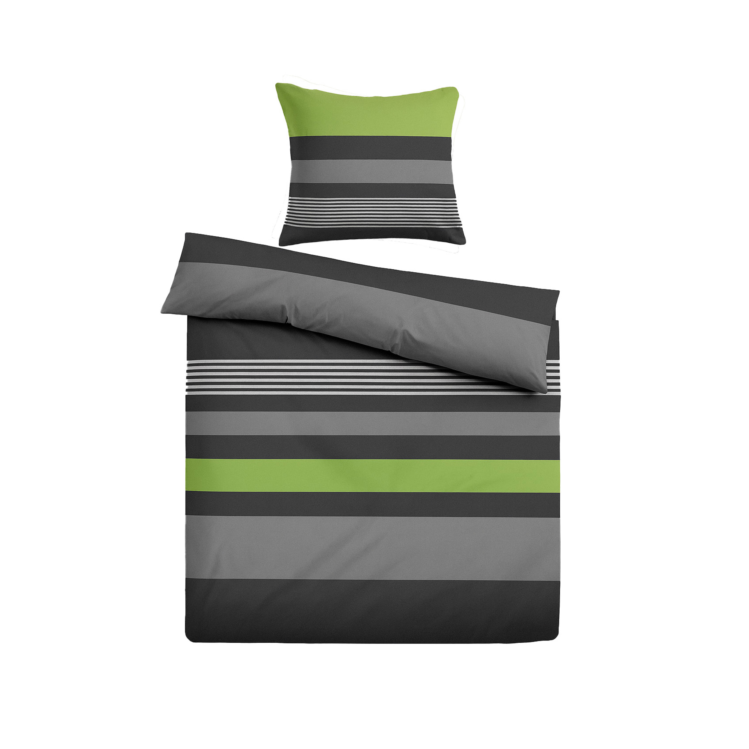 Das zeitlose Streifenmuster setzt stilvolle Akzente in jedem Schlafzimmer. Die Farbkombination aus tiefem Anthrazit, sanftem Hellgrau und einem warmen Grün-Ton wirkt modern und edel zugleich. Es ist eine harmonische Farbpalette, die Ruhe ausstrahlt und sich wunderbar in viele Einrichtungsstile einfügt. Mit der Standardgröße von 135x200 cm für den Deckenbezug und 80x80 cm für den Kissenbezug ist die Bettwäsche passend für gängige Einzelbetten.
