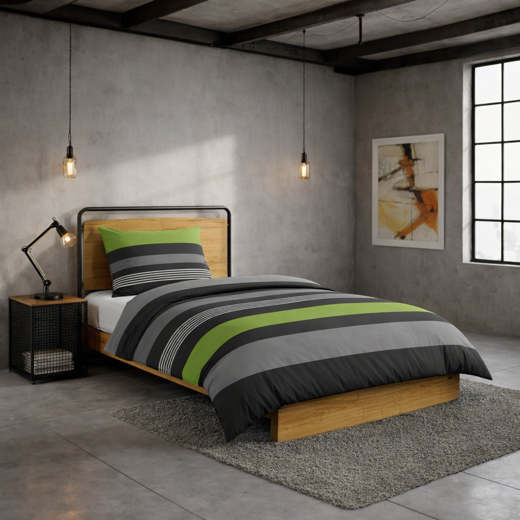 • Ideale Maße und Design: Standardgröße 135x200 cm (Decke) und 80x80 cm (Kissen) mit einem modernen Streifenmuster in Anthrazit, hellem Grau und tiefem Grün– ein zeitloser Akzent für Ihr Schlafzimmer.