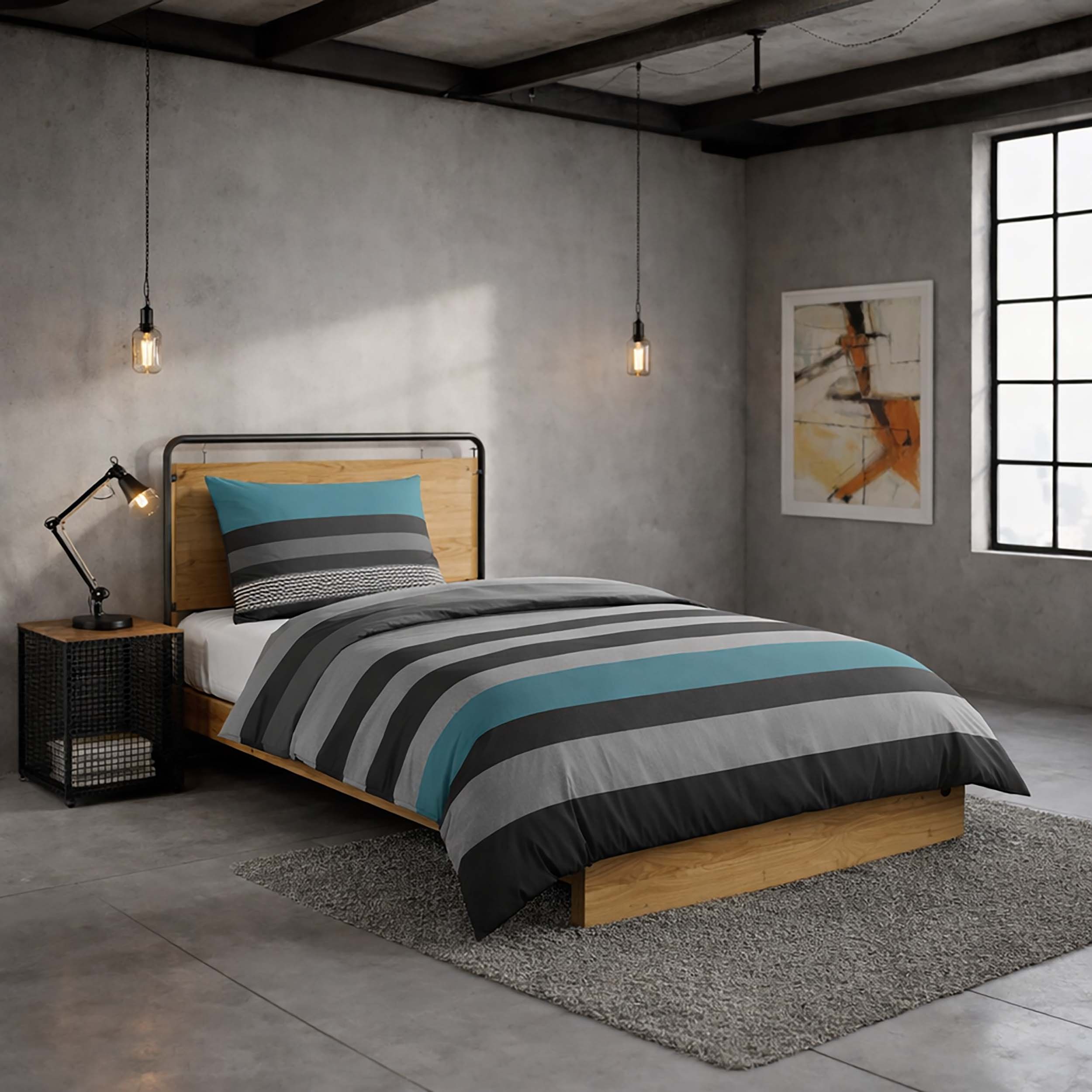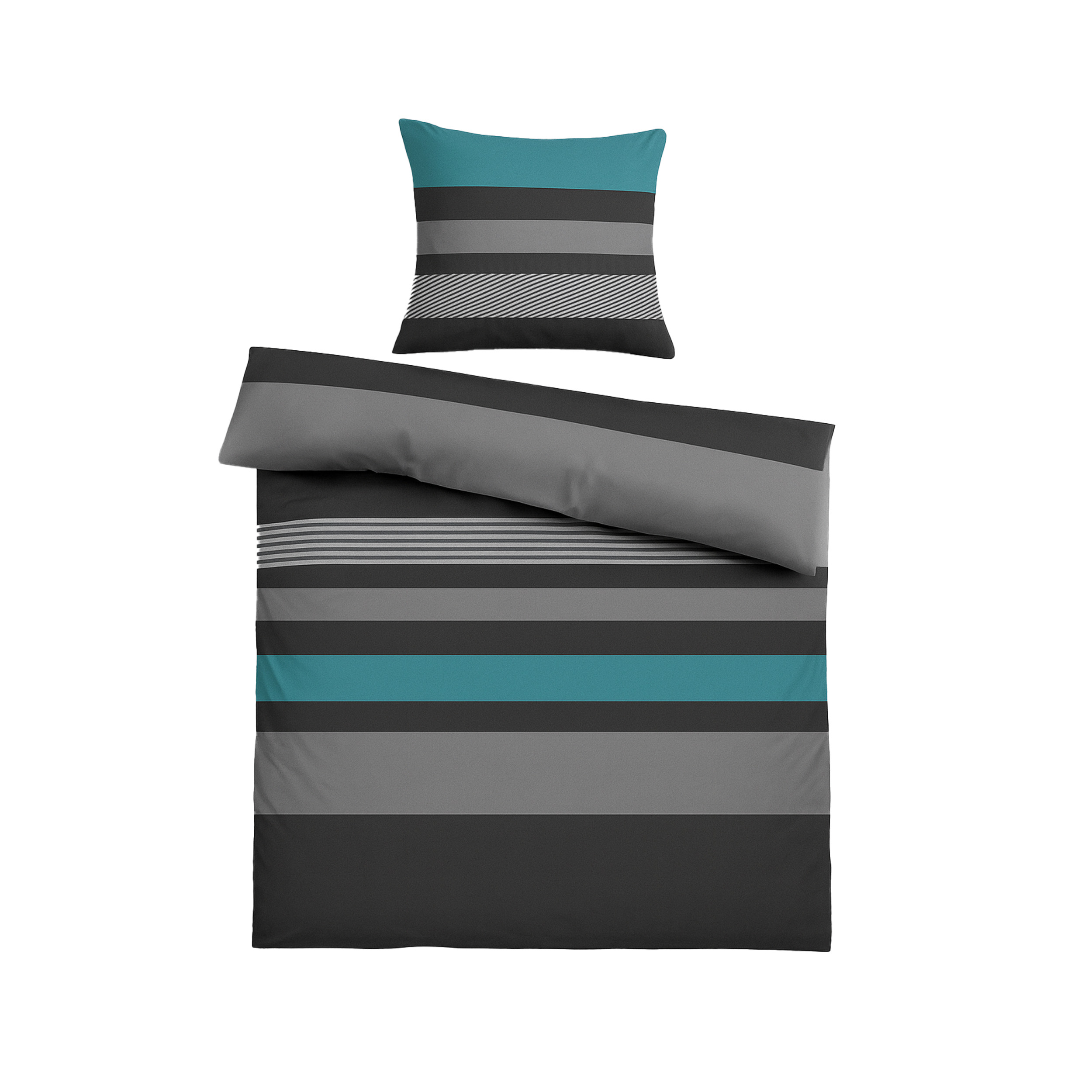 Das zeitlose Streifenmuster setzt stilvolle Akzente in jedem Schlafzimmer. Die Farbkombination aus tiefem Anthrazit, sanftem Hellgrau und einem warmen Türkis-Ton wirkt modern und edel zugleich. Es ist eine harmonische Farbpalette, die Ruhe ausstrahlt und sich wunderbar in viele Einrichtungsstile einfügt. Mit der Standardgröße von 135x200 cm für den Deckenbezug und 80x80 cm für den Kissenbezug ist die Bettwäsche passend für gängige Einzelbetten.